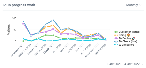 historical chart showing multiple series, one for the number of cards in each list in Trello